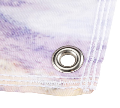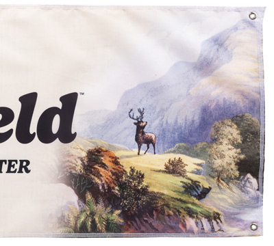 Uniqely Glenfield branded, polyester, 2'x5' banner. It has a silver grommet located in each corner and 5' of polyester rope attached to each one. Made in the USA by World Division.