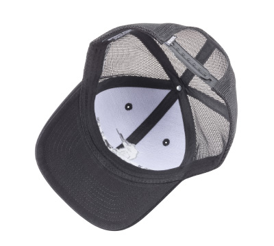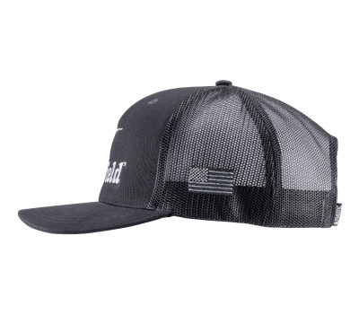 Glenfield branded black trucker cap with a structured profile. Features include a cotton sweat band, premium soft mesh in black, and a snap back closure. One size fits most.