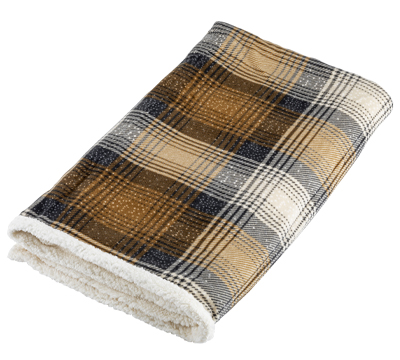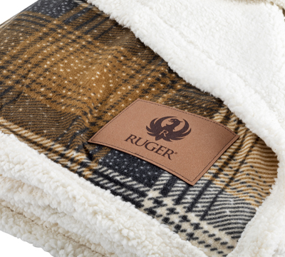 Ruger branded Kanata Cottage Grey Plaid Throw. 100% polyester, super-soft polar fleece reversed with faux lambswool in vanilla. 50" x 60"