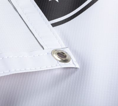 National Ruger Day branded, white vinyl, 2'x5' banner. It has brass grommets located at each corner and includes four 5" polyester ropes. Made in the USA by World Division.