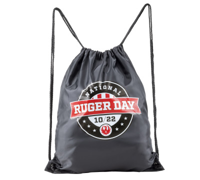 This black National Ruger Day versatile pouch backpack has a cinch closure with two black shoulder straps. Dimensions 13-1/2" wide and 16-1/2" long.