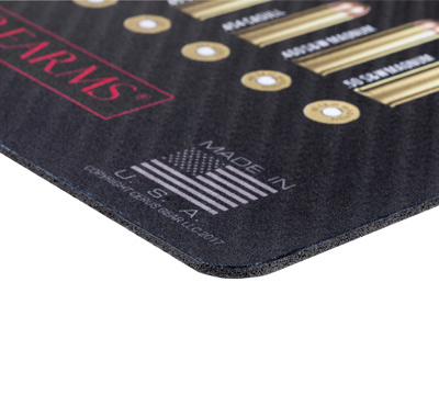 This colorful 12” x 17” handgun cleaning mat displays the most popular handgun cartridges at scale for easy reference. The lightweight, heavy-duty cleaning mat provides a spacious, padded work area for cleaning and maintaining your firearms. The mat is constructed from 1/8" (3mm) vulcanized rubber with a soft heat bonded polyester that protects firearms from scratches. The non-slip textured rubber base protects your work surface from damage and the mat rolls-up for easy storoage. The dye-sublimated printing won’t wear or rub off, is solvent and oil resistant and includes the Ruger logo and tagline. To clean your mat, apply mild dish soap, agitate & lather with fingers or rub the top cloth together. Rinse the mat with warm water and air dry. The mat is covered by the manufacturer’s lifetime warranty. Designed and printed in the US by Cerus Gear.