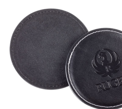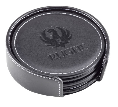 Ruger branded debossed vintage round leather coasters. Bonded leather with classic contrast stiching. Coasters have a smooth velvet backing. Includes 4 coasters and a holder in a two piece gift box.