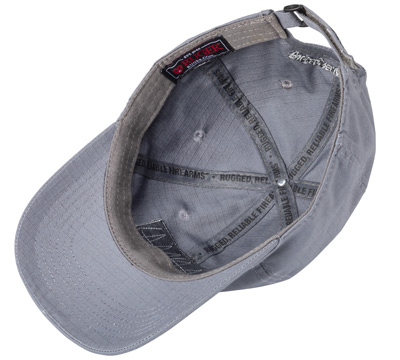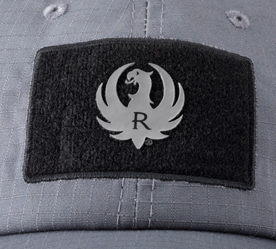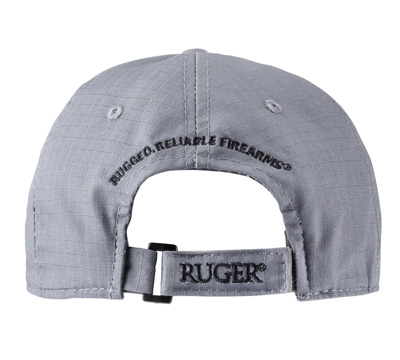 Ruger branded, low profile, gray ripstop fabric cap. Features a silicone print Ruger Eagle on a Velcro patch, and a D-ring Velcro closure. One size fits most.