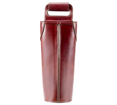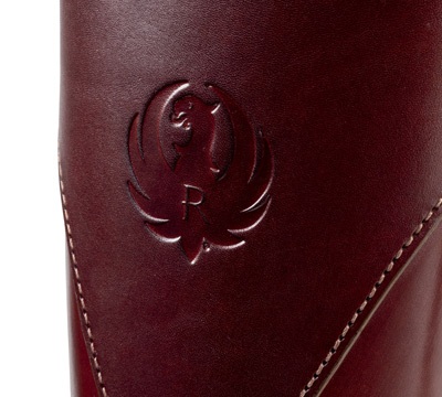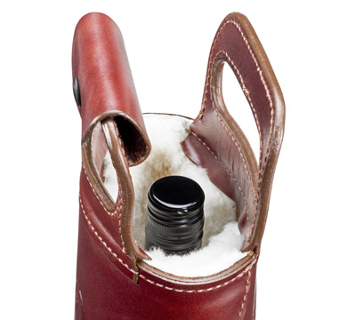 This beautiful wine tote is crafted from premium vegetable tanned leather with a rich Havana Brown finish. The inside of the tote is padded with thick sheepskin to make sure the bottle is held snugly to avoid damage. The wide handle cut-out accommodates the largest of hands and the tote includes a heavy-duty Ruger-branded snap button to secure the bottle. The body of the tote is just over 12” tall so it holds a normal sized bottle of wine or spirits below the lip for added protection. The tote is 4-1/4" in diameter and 15-1/2" tall and includes an embossed Ruger eagle. Made in the USA by Triple K.